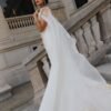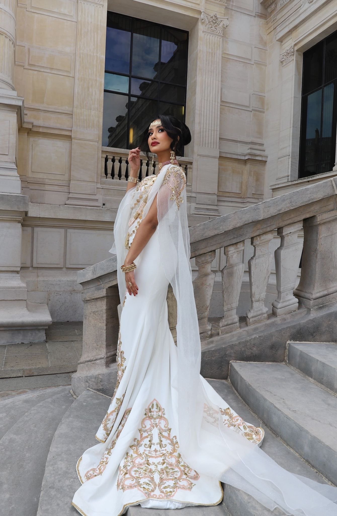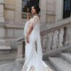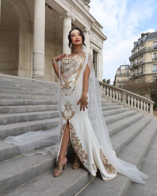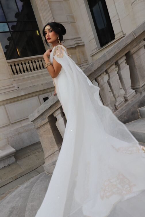 La tenue met en valeur la silhouette avec son tombé harmonieux et sa traîne majestueuse, tandis que le voilage léger sur les épaules apporte une touche aérienne et poétique. Les motifs des robes chaouia traditionnelles, réinterprétés avec délicatesse, rappellent un héritage artisanal sans égal, tout en s’intégrant dans une vision contemporaine de la mariée.