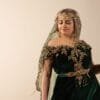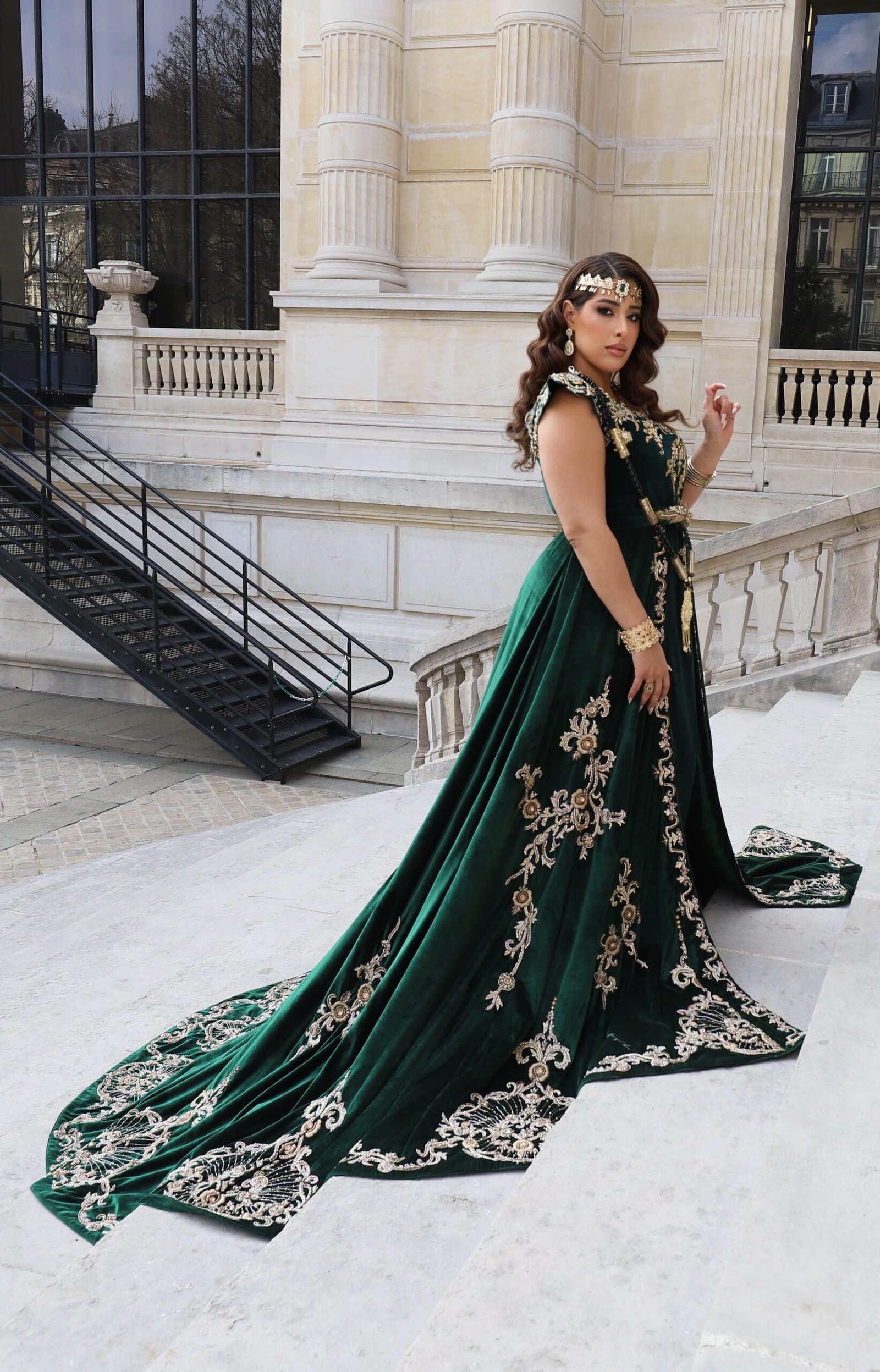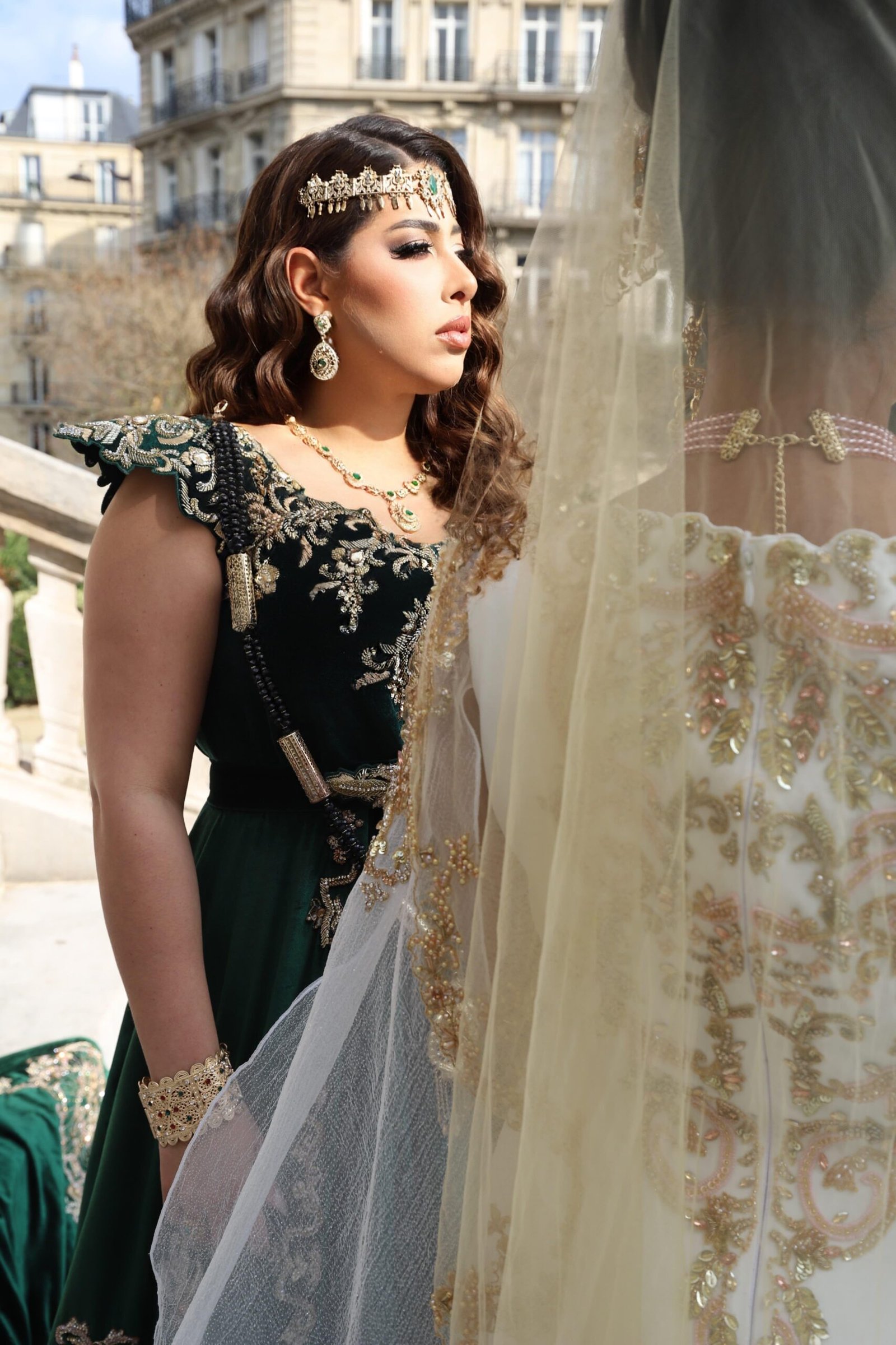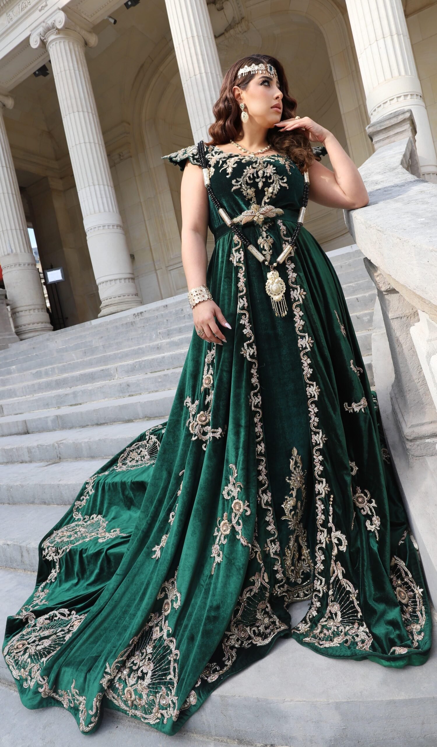 Ce majestueux fergani de velours vert émeraude peut idéalement être porté par la mariée durant le mariage ou la cérémonie du henné.