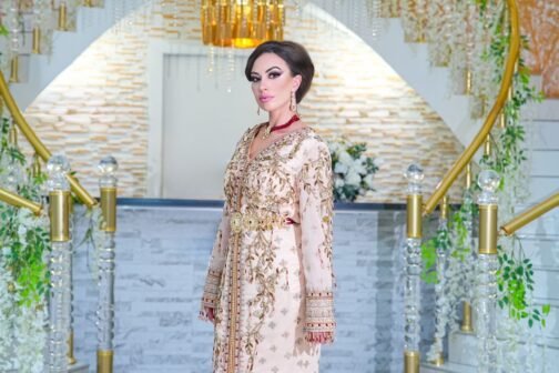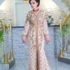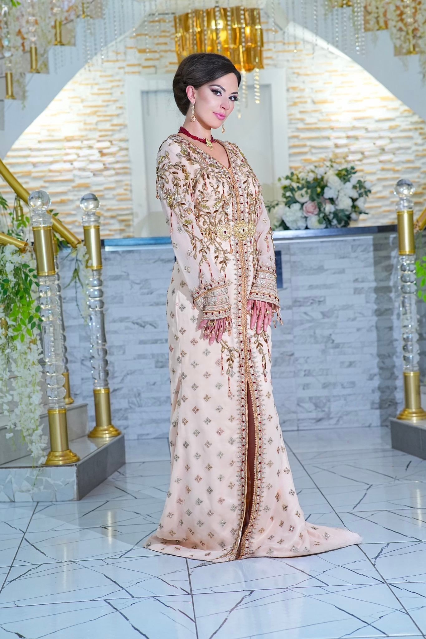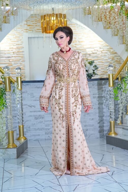 Ce caftan coupe sirène se distingue par son élégance moderne et son raffinement traditionnel. Confectionné dans un somptueux tissu nude rosé, il est orné de broderies dorées délicates et de motifs perlés qui soulignent subtilement la silhouette.