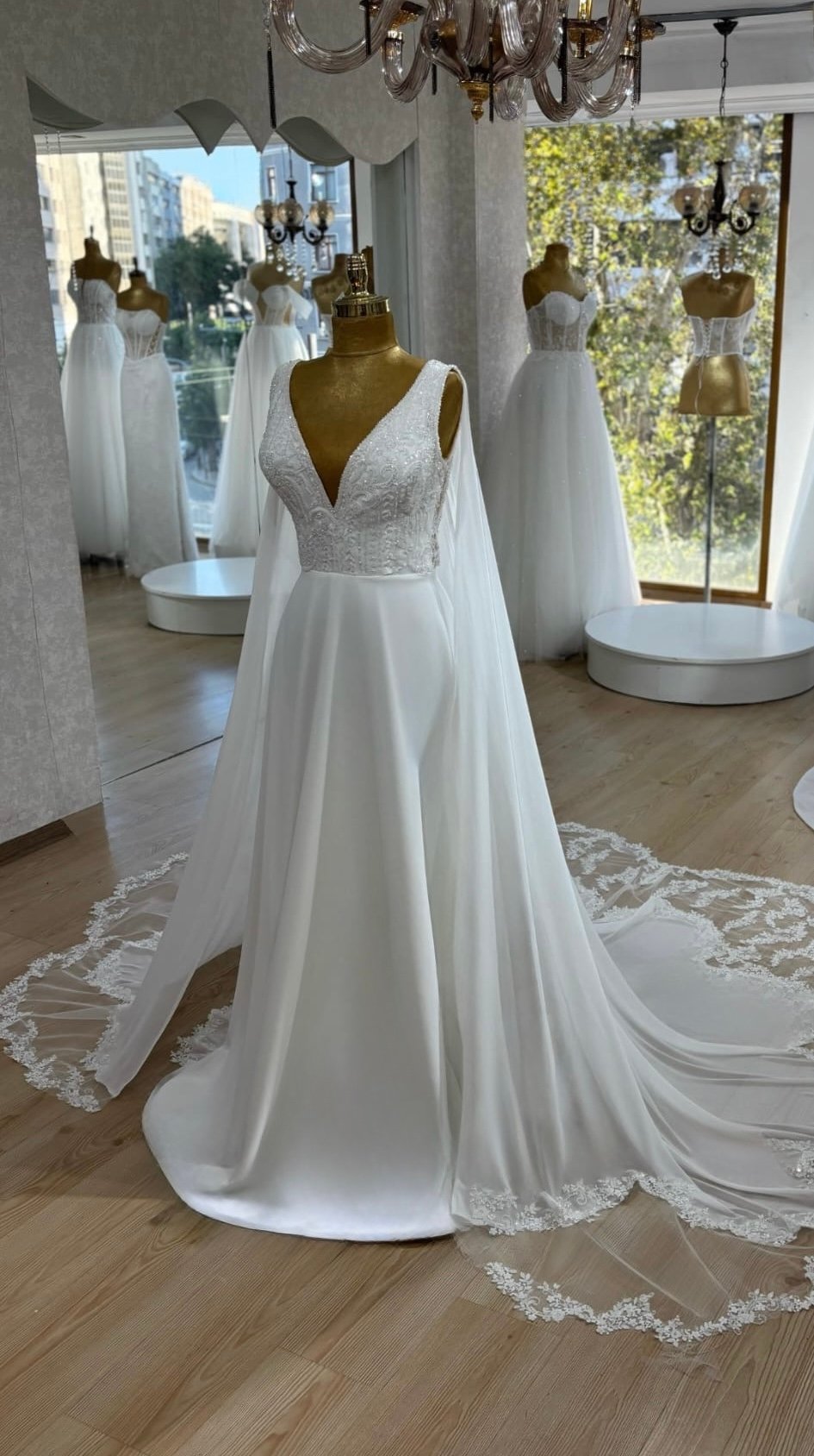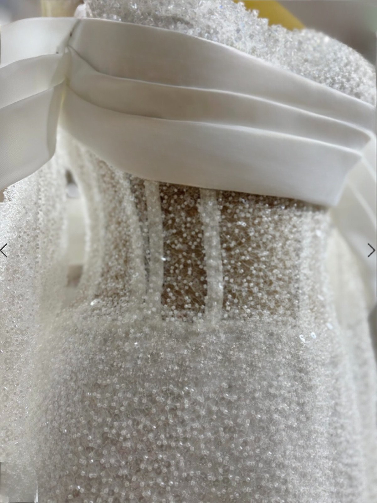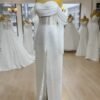 Le bustier présente un effet transparent perlé, très tendance, et se prolonge avec de magnifiques manches tombantes en satin, apportant une touche romantique et féminine.