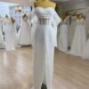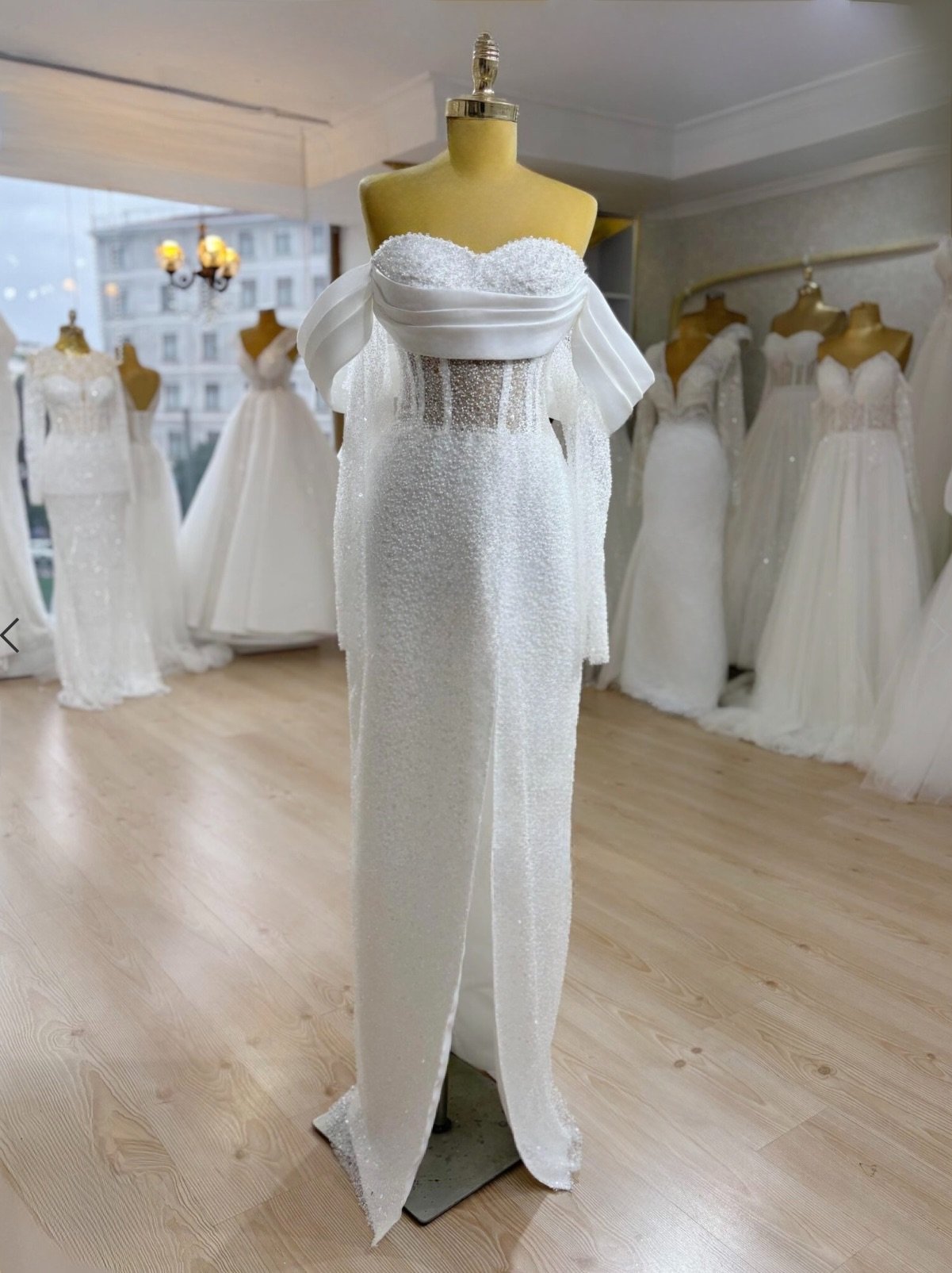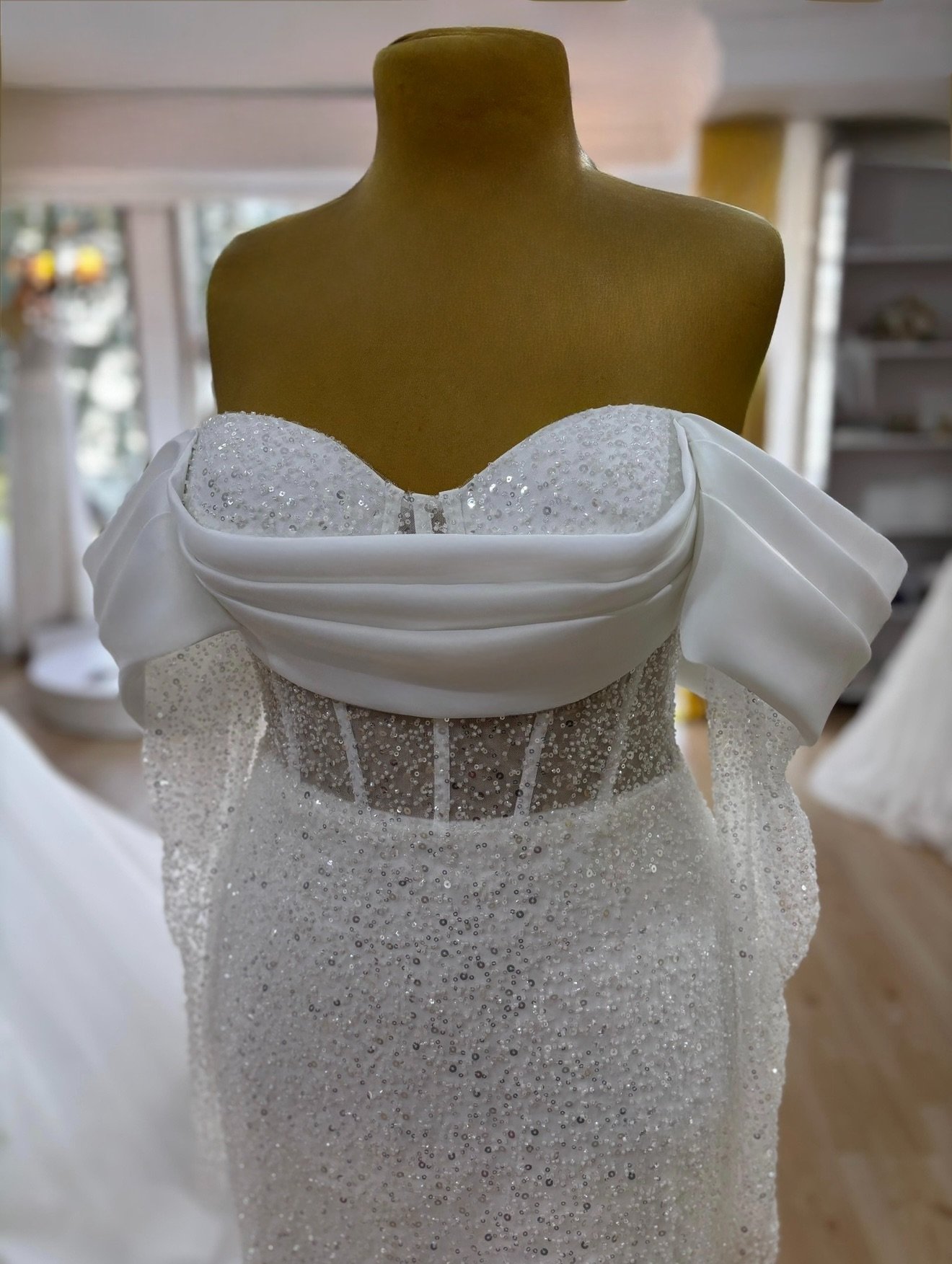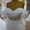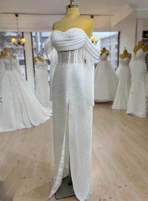 Cette robe de mariée en coupe sirène incarne une élégance contemporaine tout en mettant parfaitement en valeur la silhouette. Conçue dans un tissu intégralement perlé, elle offre un rendu lumineux et raffiné qui attire le regard tout en restant délicat.