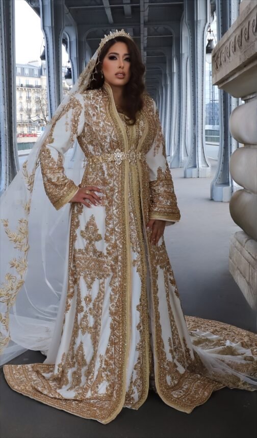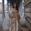Ce caftan royal blanc et doré est une pièce d’exception mise en valeur par le raffinement de sa couture, de ses broderies et de son perlage.