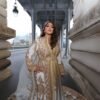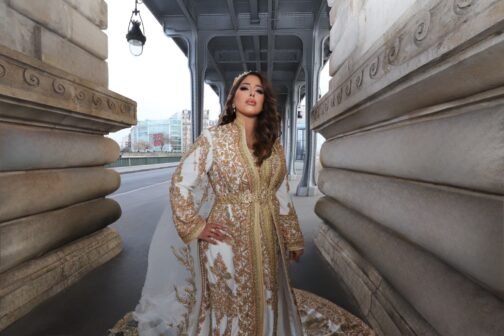 Ce caftan blanc et doré est une pièce d’exception mise en valeur par le raffinement de sa couture, de ses broderies et de son perlage. Confectionné dans un tissu blanc lumineux au tombé parfait, il est entièrement orné de broderies dorées réalisées à la main, aux motifs délicats qui lui confèrent une allure somptueuse.