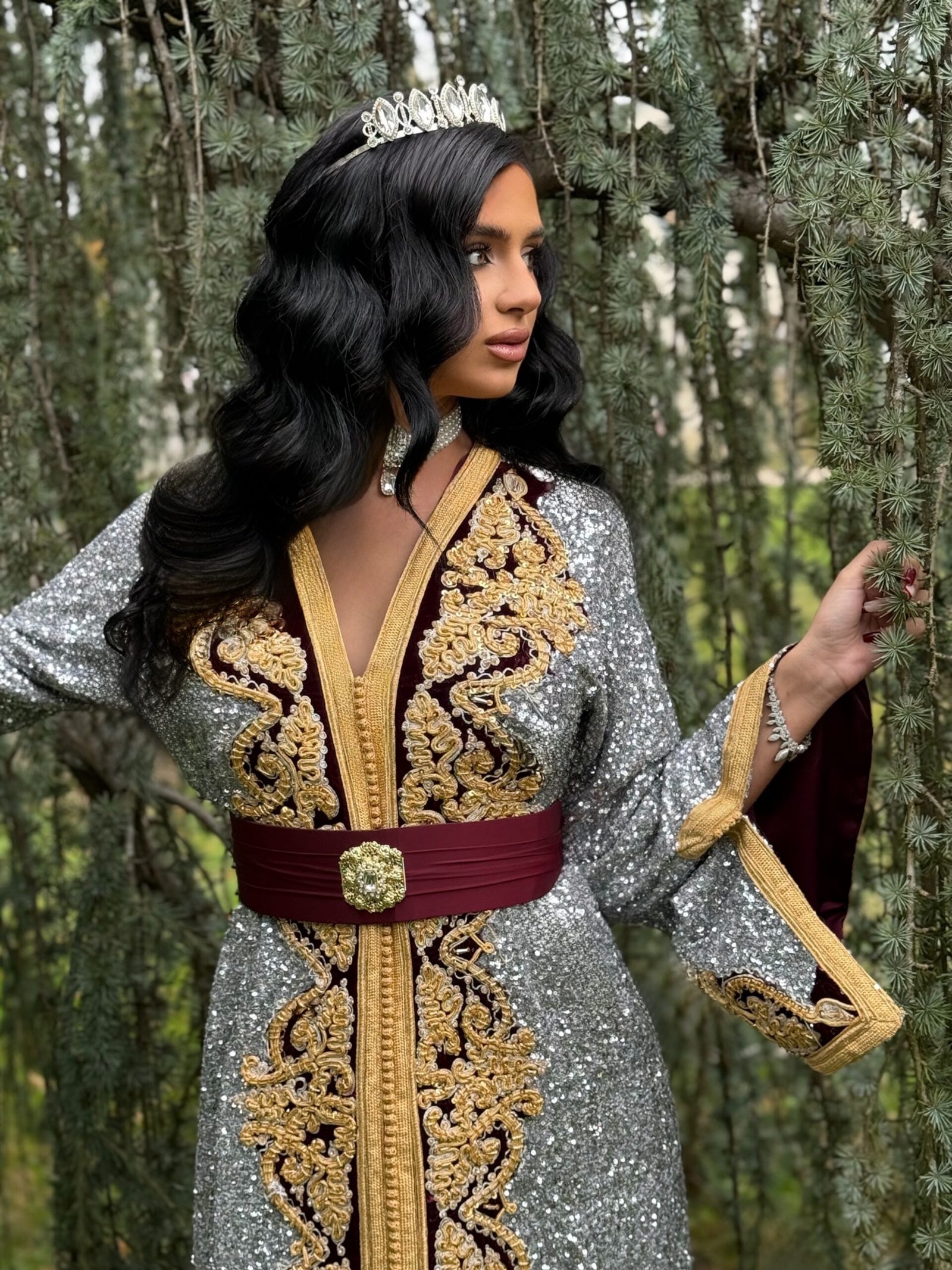Sa traîne longue et majestueuse donne une allure royale à celle qui le porte, tandis que la taille est soulignée avec élégance grâce à une ravissante ceinture dorée. Les manches richement détaillées, associées aux finitions en sfifa et aâkad traditionnels, renforcent le caractère luxueux de cette tenue.