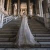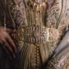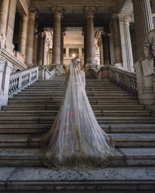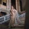 Son voile assorti, subtilement brodé, apporte une dimension royale et complète la tenue avec une légèreté spectaculaire. Chaque détail — des motifs floraux dorés jusqu’aux incrustations scintillantes — témoigne d’un savoir-faire artisanal d’une rare finesse.
