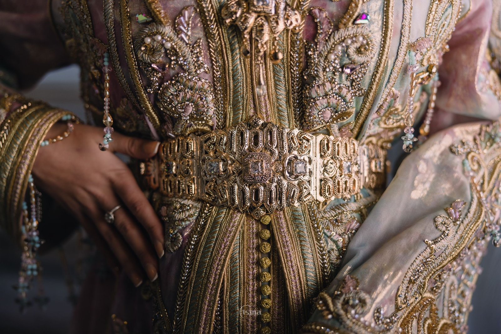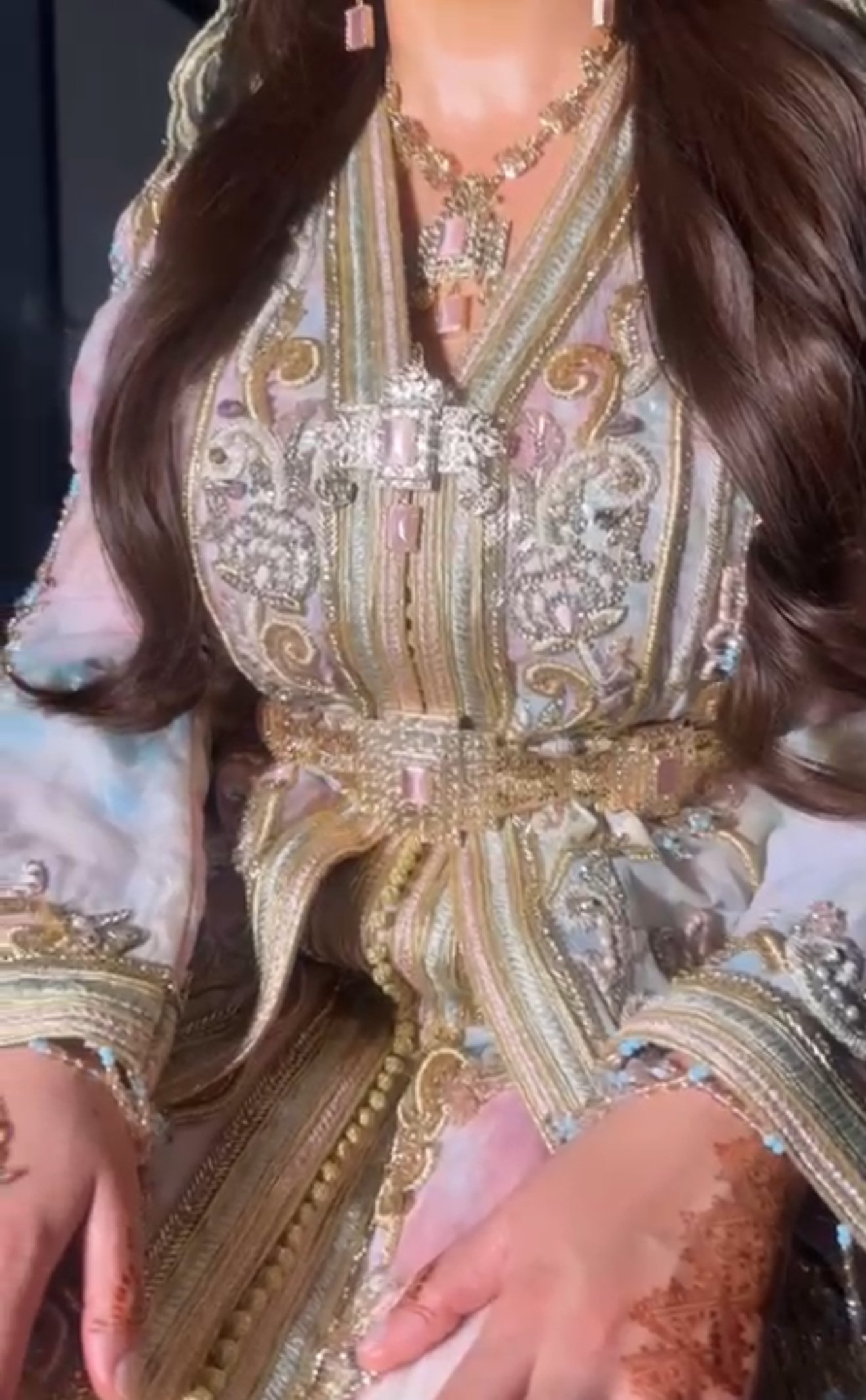 Cette takchita pastel royale est une création d’exception qui allie majesté et douceur dans une harmonie parfaite. Confectionnée dans un tissu aux nuances pastel délicates — mêlant rose, bleu et touches nacrées — elle se distingue par un travail de broderies somptueuses en fils doré et perlage minutieusement appliqué à la main.
