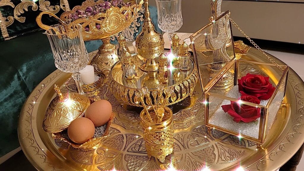 Ils apportent avec eux les Tayfors dans lesquels sont joliment disposés ces présents. Il peut s’agir de vêtements et de sous-vêtements, de bijoux, de parfum, de vaisselle ou encore de henné, de fruits secs, de dattes, de sucre et de lait.