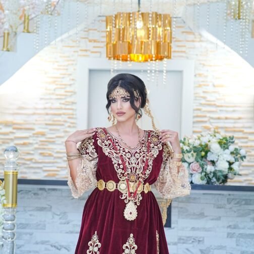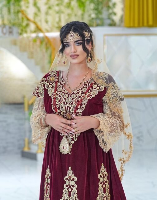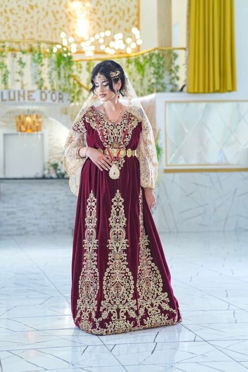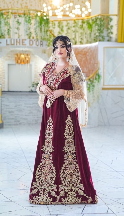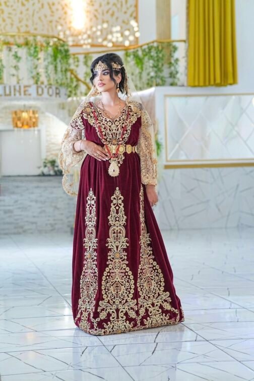Ce fergani constantinois est une pièce d’exception qui incarne toute la richesse du savoir-faire algérien. Confectionné dans un somptueux velours bordeaux profond, il se distingue par ses broderies dorées, dessinant des motifs raffinés et harmonieux.