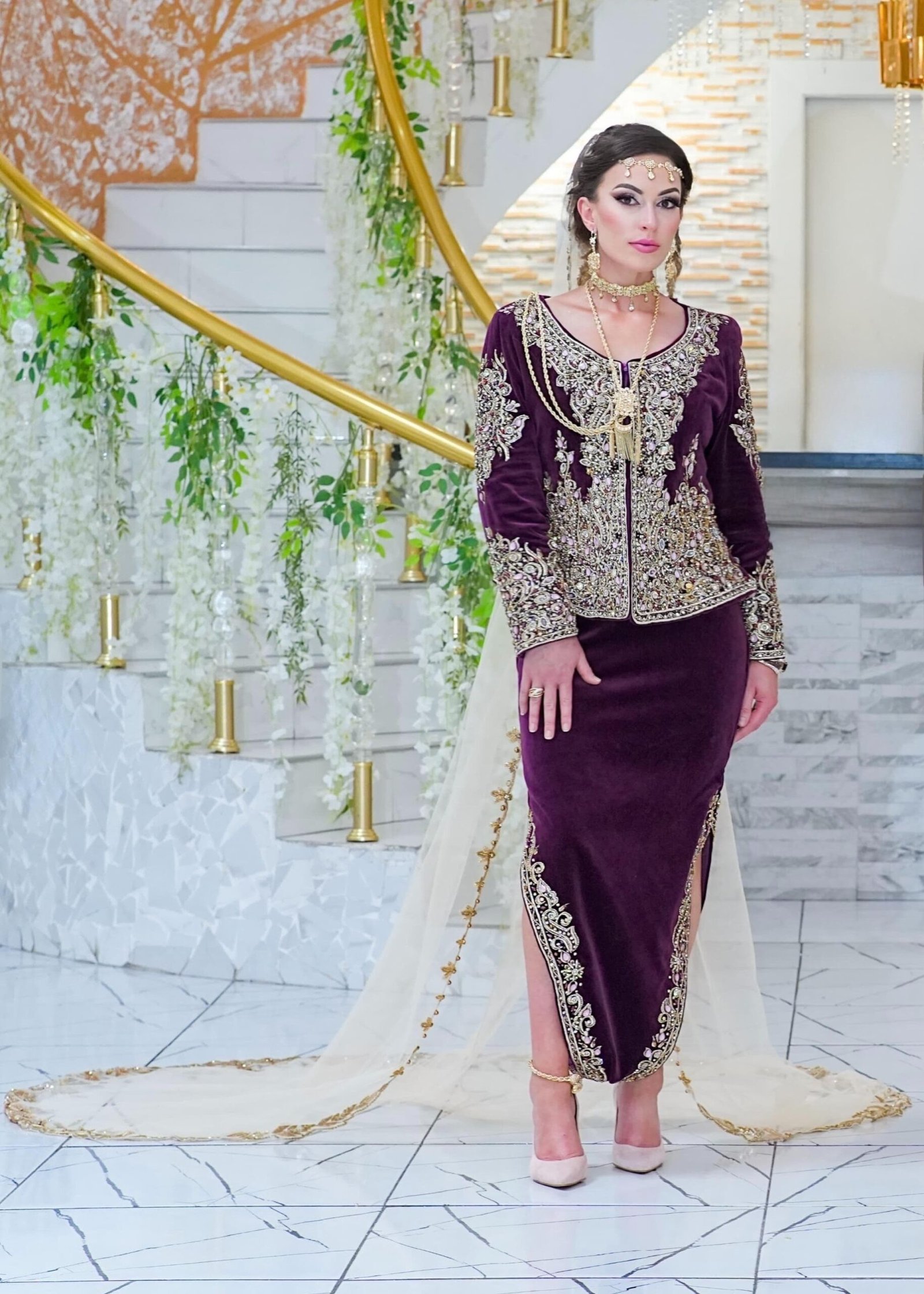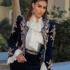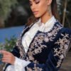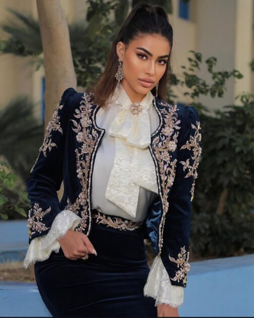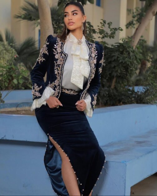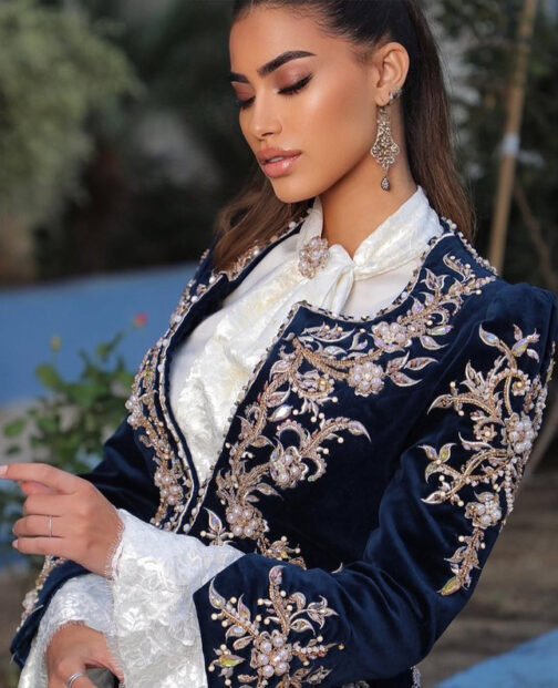 Élégant karakou traditionnel en velours bleu nuit, sublimé par des broderies dorées et d’un somptueux perlage.