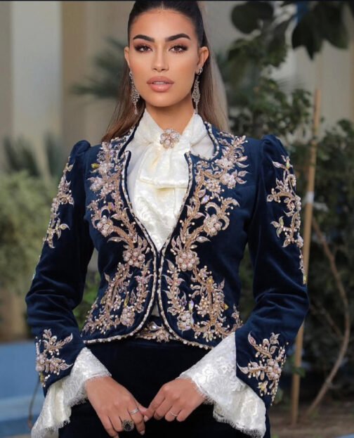 Sa veste cintrée au style royal est accompagnée d’une chemise raffinée aux manches bouffantes et aux finitions en dentelle.